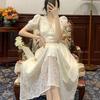 One Piece Dress Korean V-Neck Elegant Vintage Dress Women Puff Sleeve Lace Dress Evening Party Dress Females 2021 Summer Chic