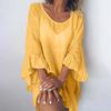 فستان نسائي أنيق بلون سادة وأكمام مكشكشة من القطن والكتان بلون سادة