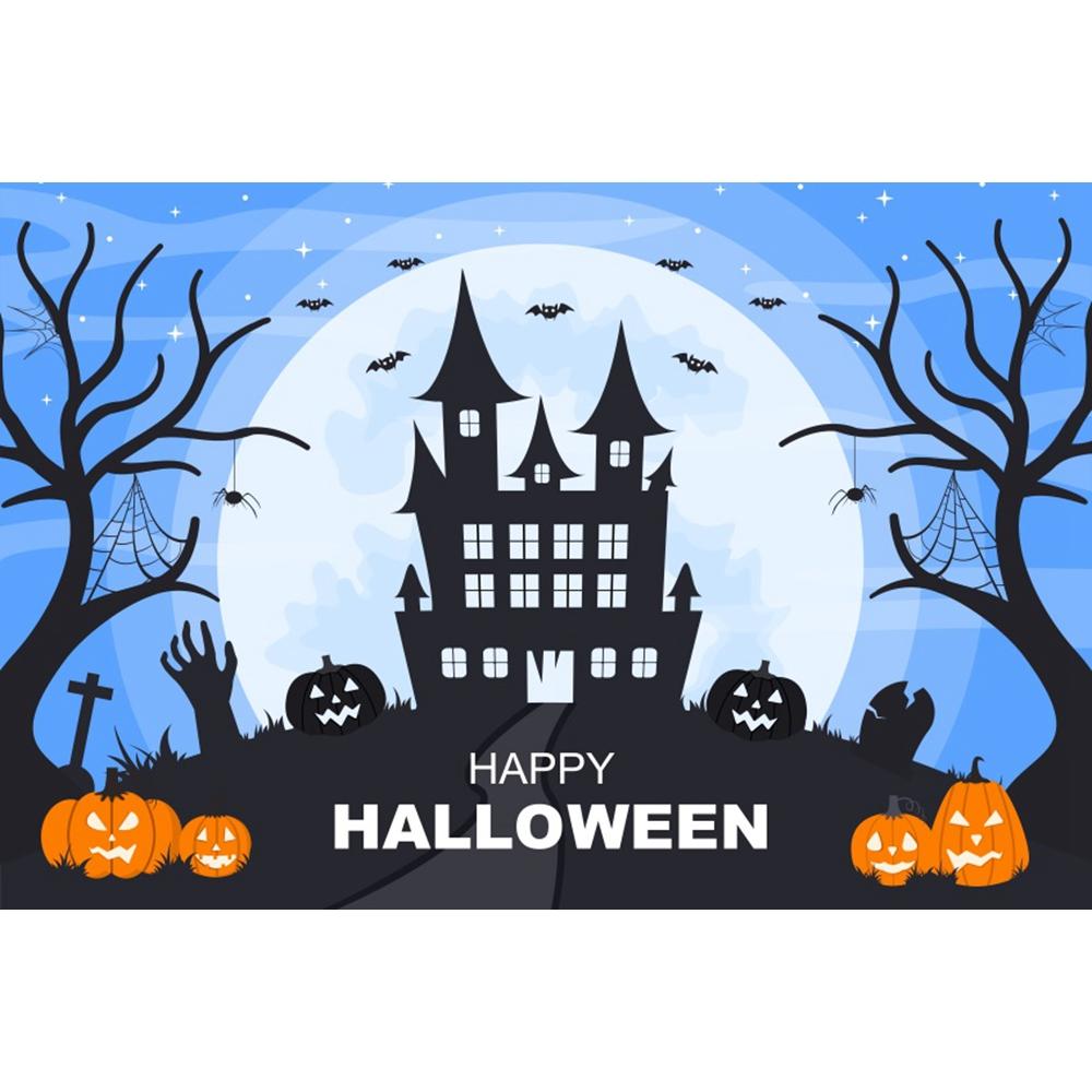 1pc Blue Halloween Party Backdrop with Night Moon Gothic Castle Pumpkin Bats Ghost Banner for Halloween Themed Party Decoration