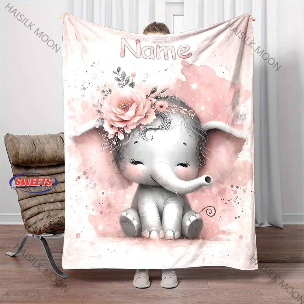 Baby Elephant with Flowers Printed Blanket Custom Name Blanket Bed Office Shawl Four Seasons Blanket Multiple Sizes Special Gift