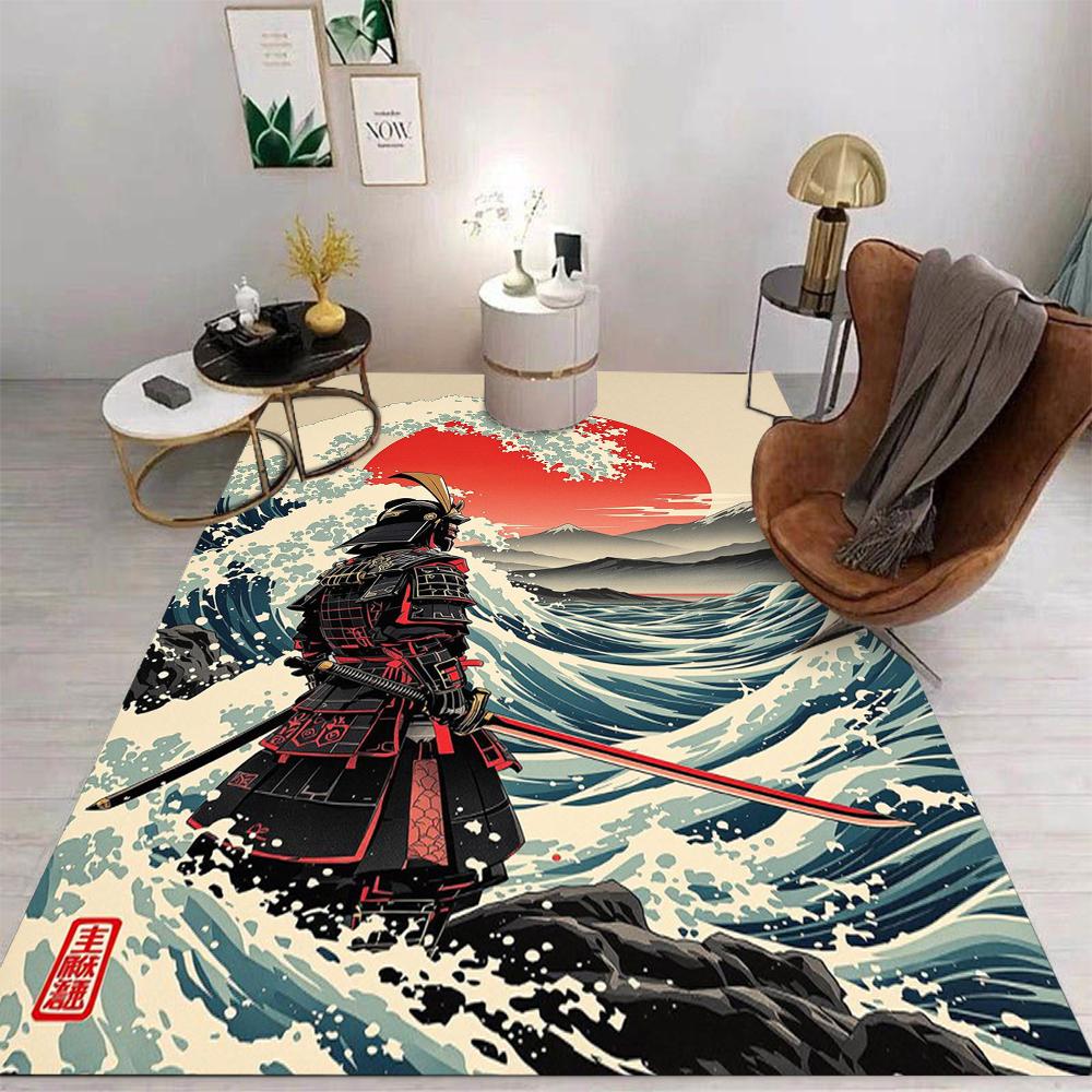 Samurai Warrior Carpet Mat Rug Red Sword Japanese Art Dark Theme Mountain Water Home Decoration Living Room Game Room Floor Mat
