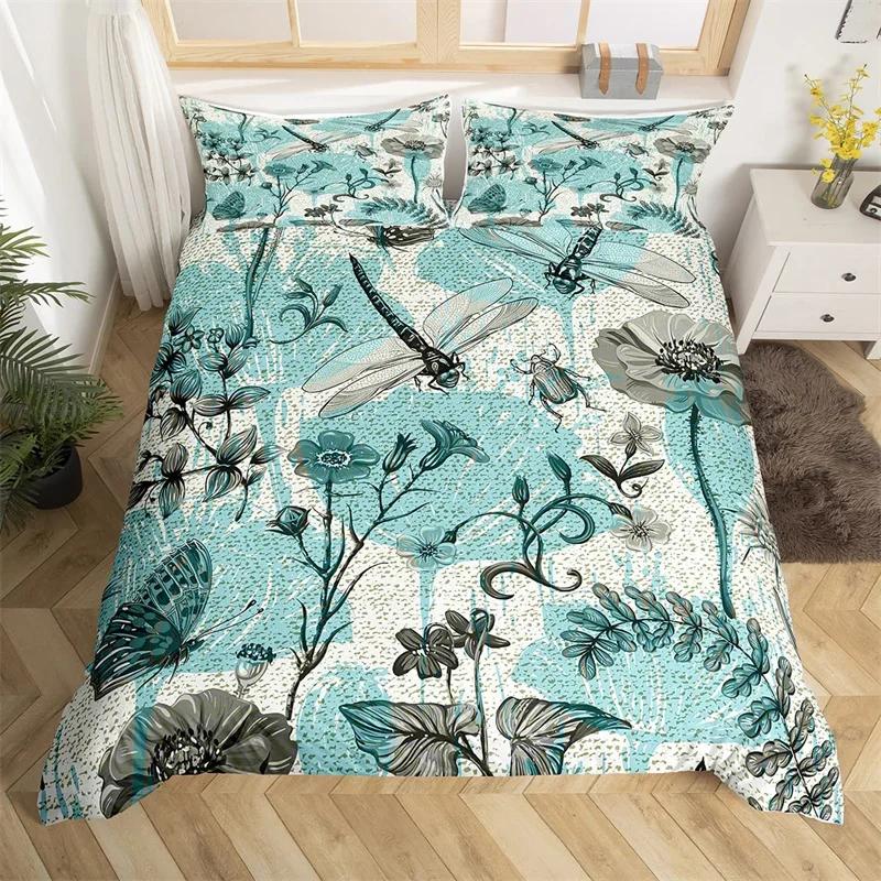 Dragonfly Duvet Cover King Butterfly Flower Leaves Bedding Set Microfiber Nature Animals Plants Quilt Cover For Teens Girls Room