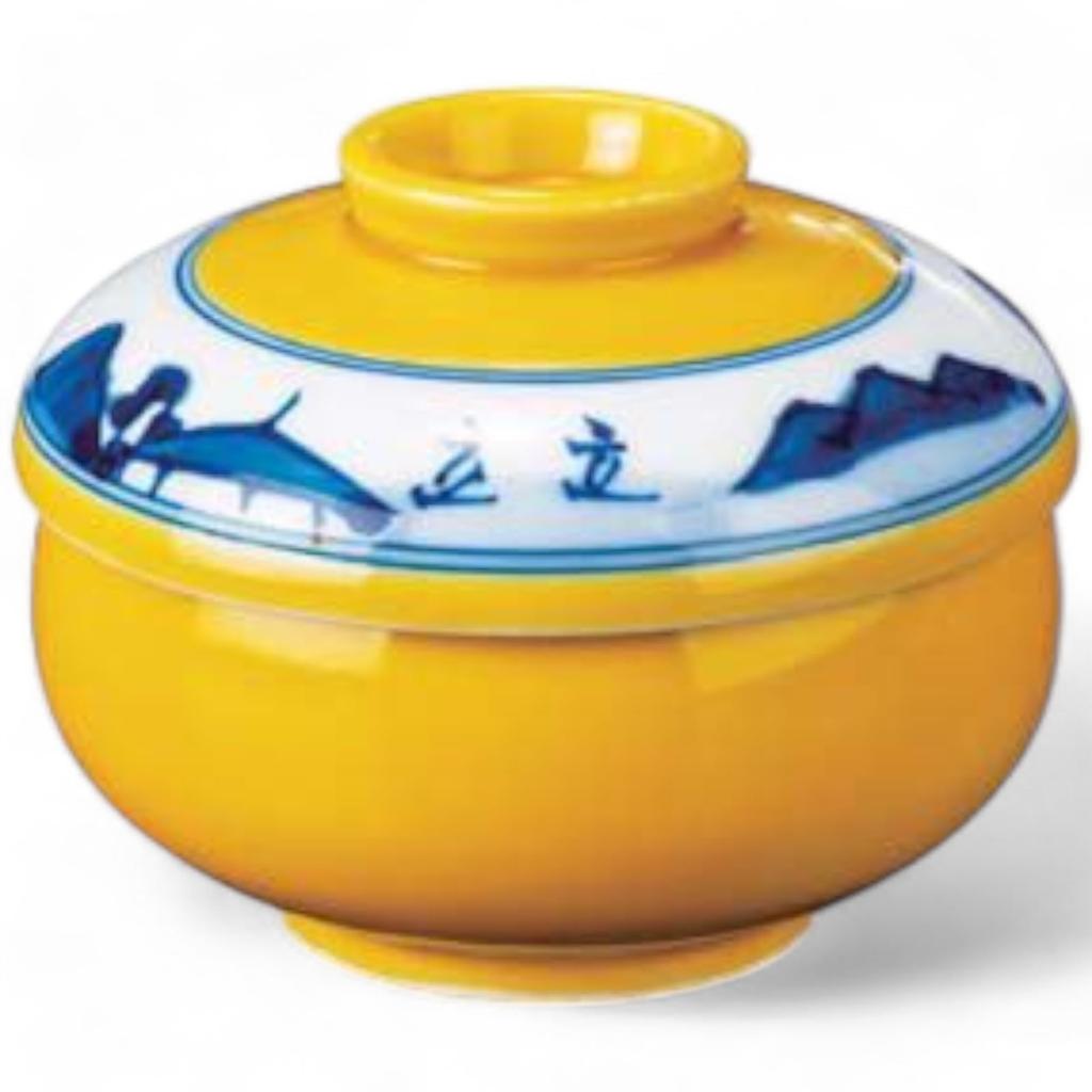 Takumifu Arita Ware 9cm Steaming Bowl with Yellow Glaze and Landscape Design, Made in Japan