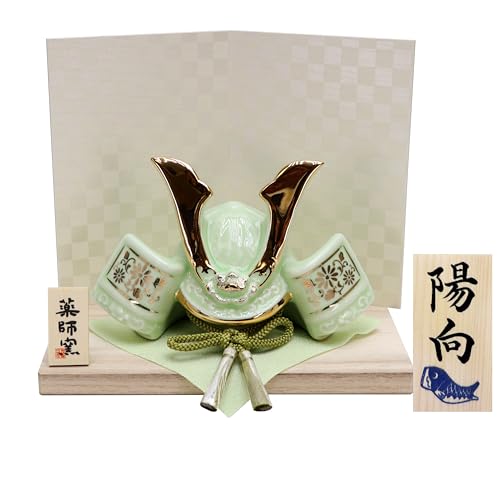 Osaka Choseido May Doll, Compact Miniature Ceramic, Personalized Wooden Tag Included (Sent Separately), Dyed Painting of Success Helmet (Light Green)
