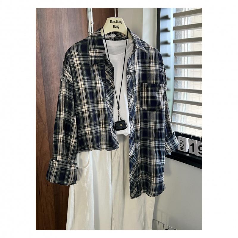 Man Jiang Yue Navy Blue Plaid Women's Long Sleeve Shirt - Hong Kong Style Chic & Lightweight
