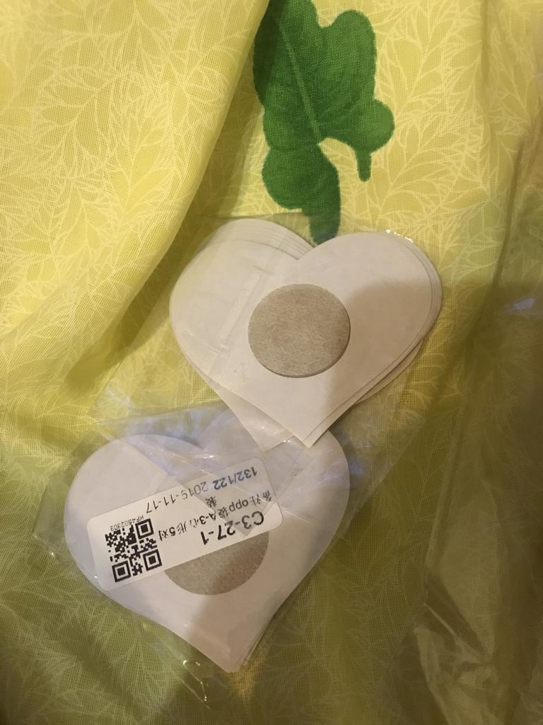 Balíček šel asi měsíc. Přišlo přesně 10 kusů (5 párů) samolepek na bradavky, odpovídaly popisu, materiál je hutný, bradavka bude prosvítat (na druhé fotce vidíte ukázku stroje). Drží, drží - no, jsou takové průsvitné, jako pro mě, rozhodně ne na světlé, průhledné oblečení