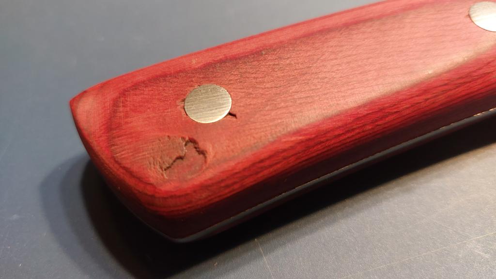 Na střenkách velký kaz ve dřevě. Vyštípnuté dřevo u nýtu.