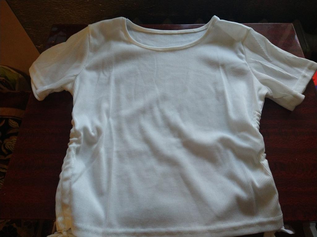 Tričko s krátkým rukávem a květinovým potiskem. Je trochu průhledná, ale není to prakticky vidět (na obrázcích mám na sobě černou podprsenku, takže u tělové nebo bílé si ničeho nevšimnete) Látka je velmi odolná, po mnoha praních zůstává úplně stejná jako první den, na obou stranách má tkaničky pro stažení a přizpůsobení tělu. Ideální pro horké dny, protože velmi dobře dýchá a chladí. (Velikost S, ideální pro hrudník 90c)