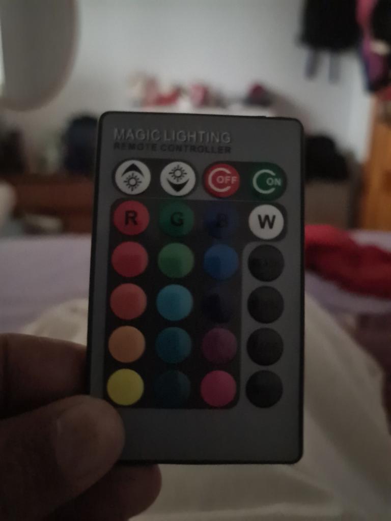 Žárovka všech barev s dálkovým ovládáním. Jednou vyzkoušeno. Funguje velmi dobře. Vybírá se v 15W . Pozor ⚠️ baterie 🔋 není součástí balení ... plochá baterie 2025 nebo 2032 . Joom