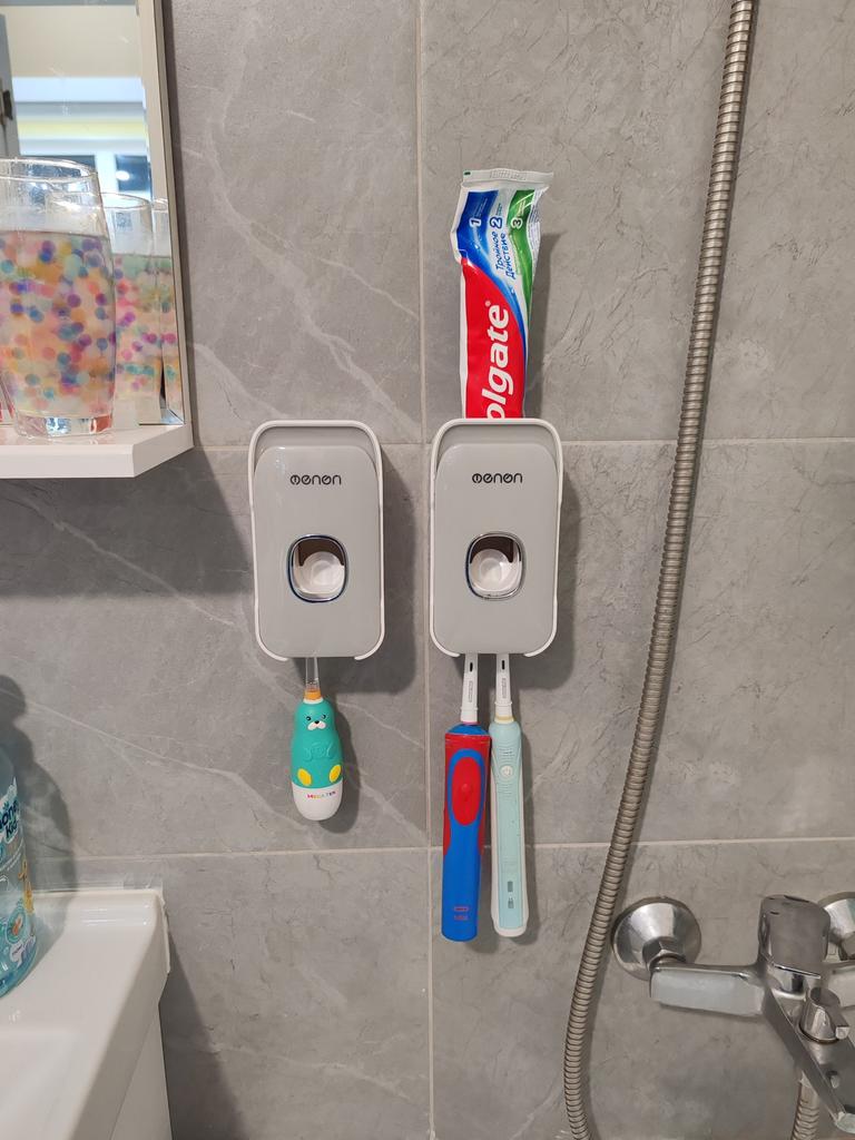 Super dávkovač. R Můžete umístit 2 zubní kartáčky a zasáhnout jednu zubní pastu. Funguje perfektně. doporučuji