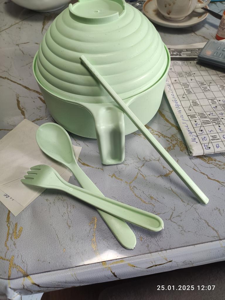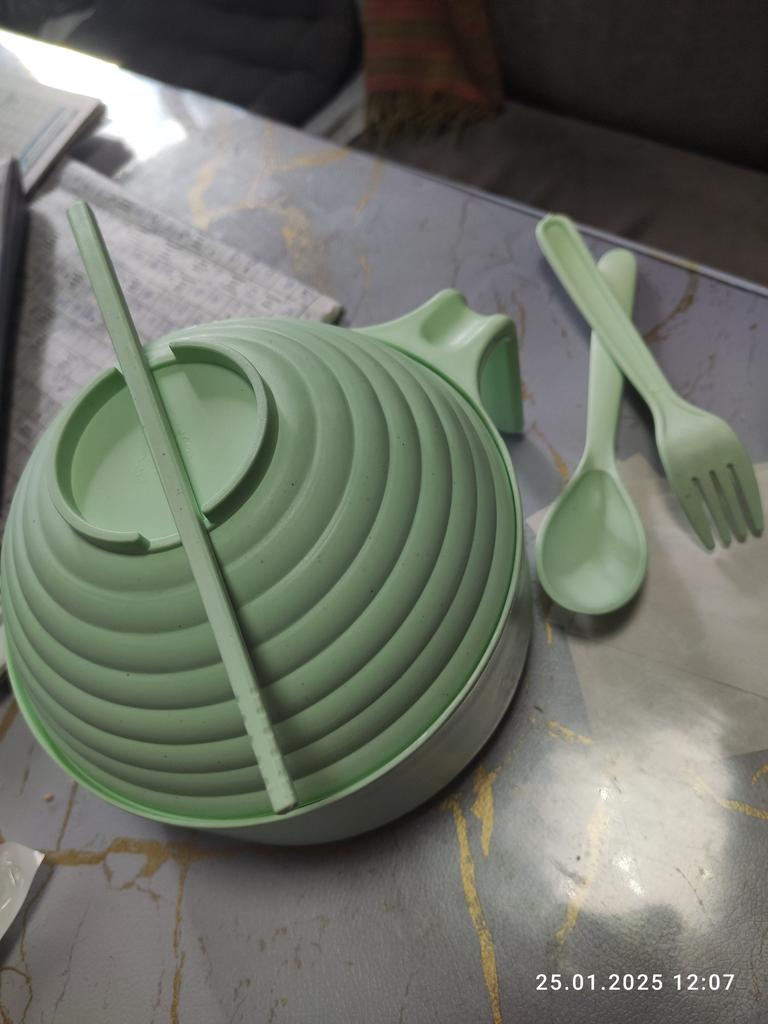 Byl zabalený tak, že se lžíce, vidlička a hůlky hodně ohýbaly (hlavně vidlička a hůlky). Je děsivé je uvolnit silou, protože plast se může zlomit. V této podobě není vhodné jej používat.