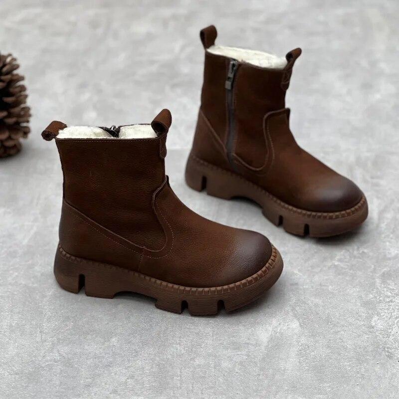 Johnature Vintage ručně vyráběné boty z pravé kůže s kulatou špičkou zesílená teplá silná podrážka dámské krátké boty