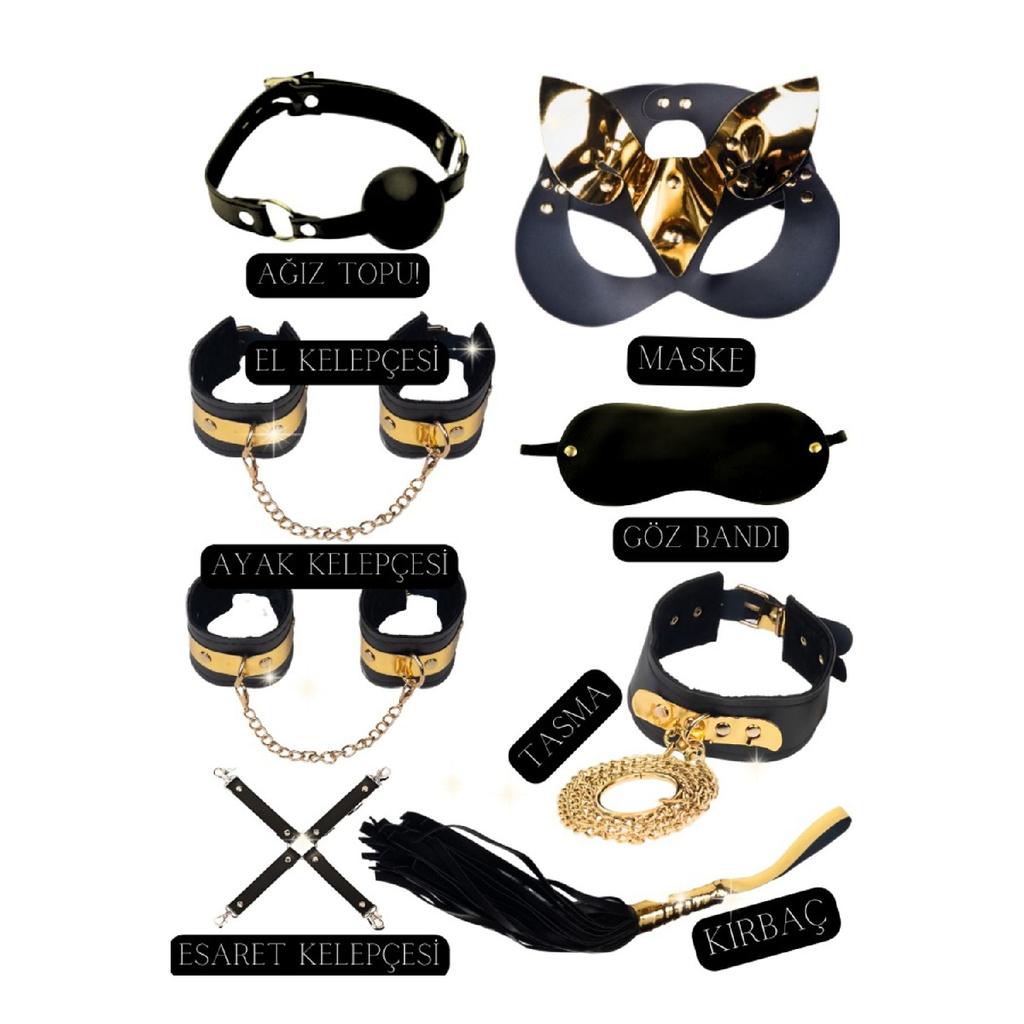 Fantasy Set With Whip, Leash, Plush, Handcuffs, Mask, Set Of 8 Gold, Gold Belt — koupit zboží online s dopravou zdarma po celém světě!
