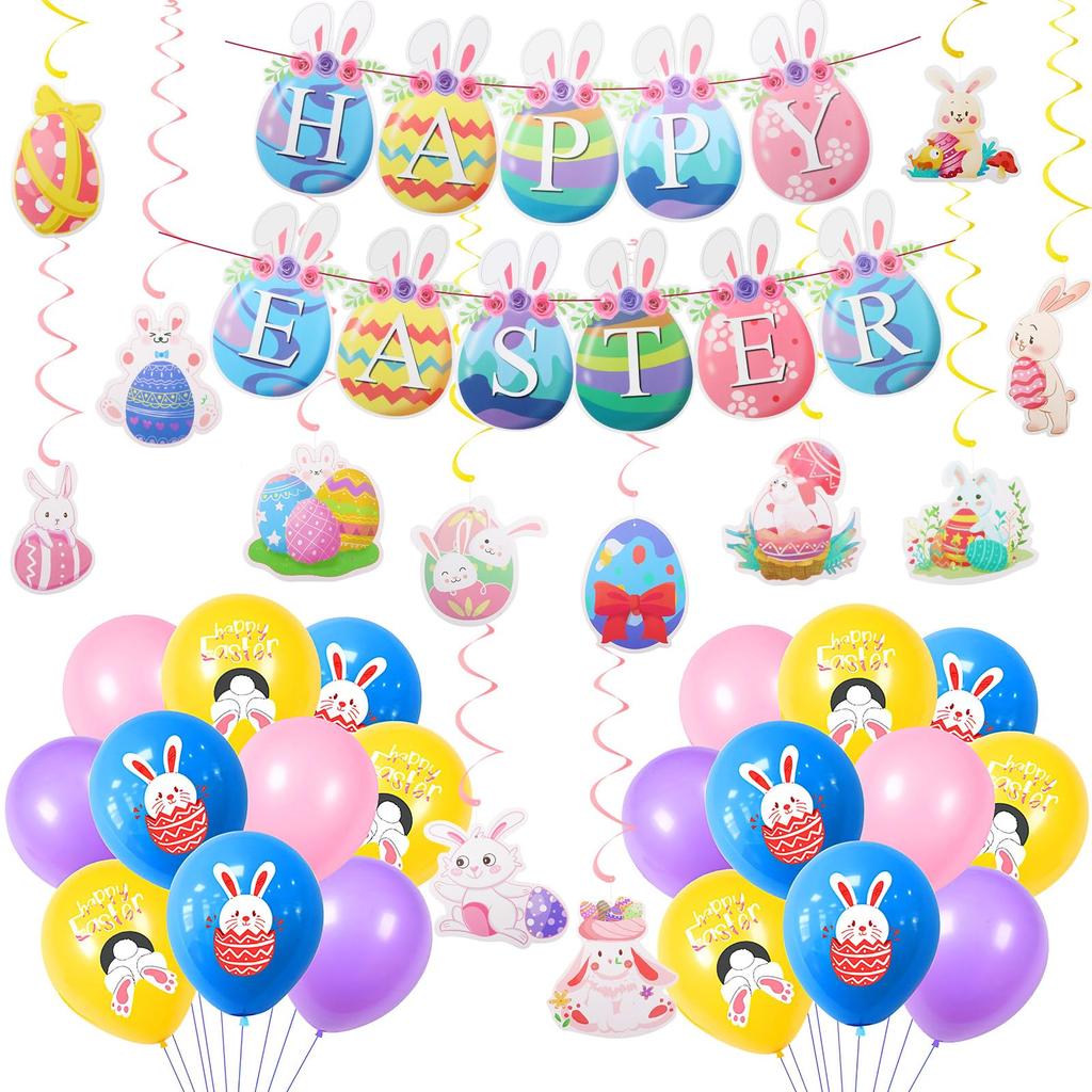 [Obsah produktu] Velikonoční girlanda x 1 sada, velikonoční balónky x 20, závěsné karty x 12, závěsné víry x 12