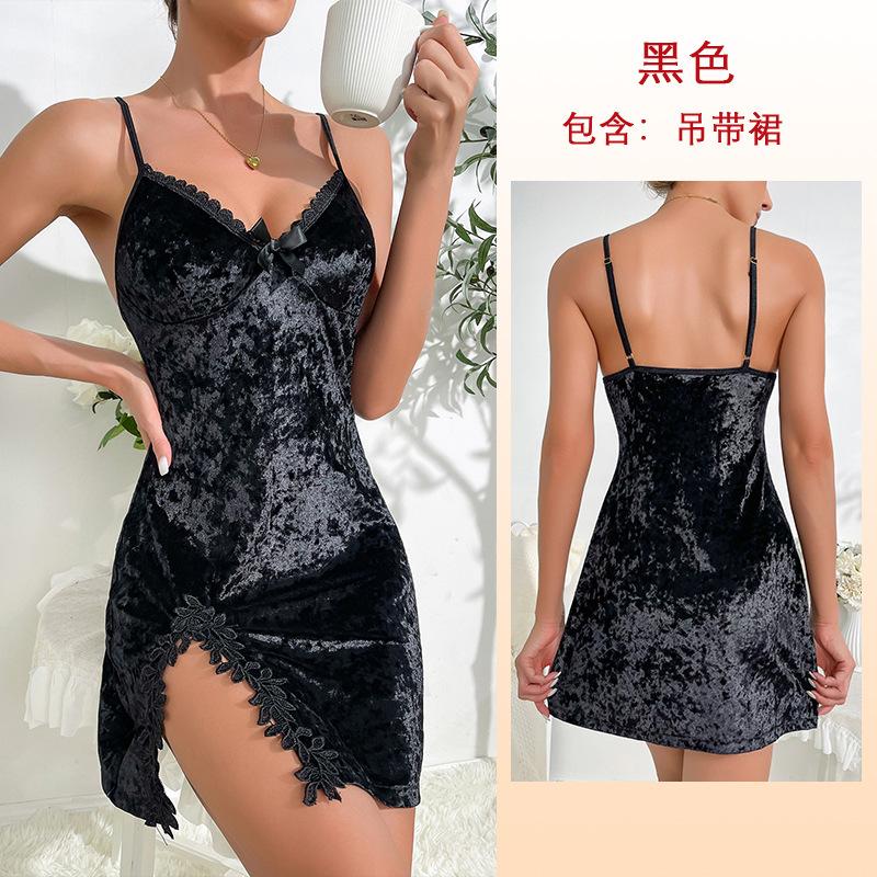 New velvet sexy lace split suspender nightdress backless seduction clothes pajamas women