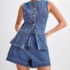 Vintage Blue Denim Sleeveless Single Breasted Tops Women's Suit Summer 2025 Sleeveless Jean Jacket Top Shorts Sets 2 Piece Sets