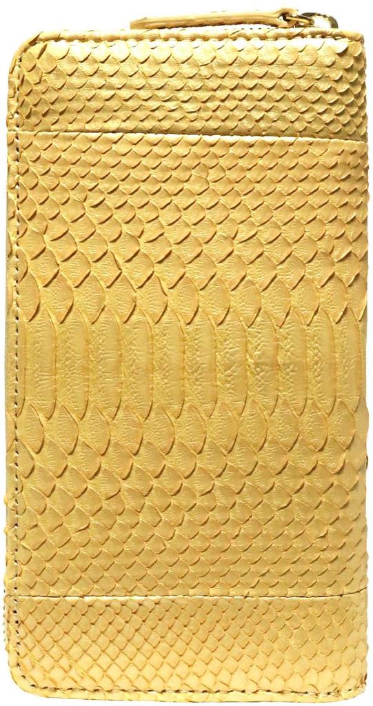 The Snake, which is the zodiac sign of 2025, is extremely popular among those who value it as a lucky charm, warding off bad luck, and good luck by incorporating it into accessories. Introducing a long wallet with a round zipper made from gold-dyed diamond python. By dyeing it with a light gold color to prevent the gold from becoming too strong, we were able to create an elegant gold color while retaining the python pattern. The gold contrast created by the shading of the scales creates a very beautiful finish. Because snakes repeatedly shed their skin and grow, they are associated with ``infinity'' and ``regeneration,'' and have been worshiped as ``messengers of the gods.'' It is also popular as a talisman for people who care about feng shui and fortune. Gold has the image of the sun and is said to be a symbol of abundance.
