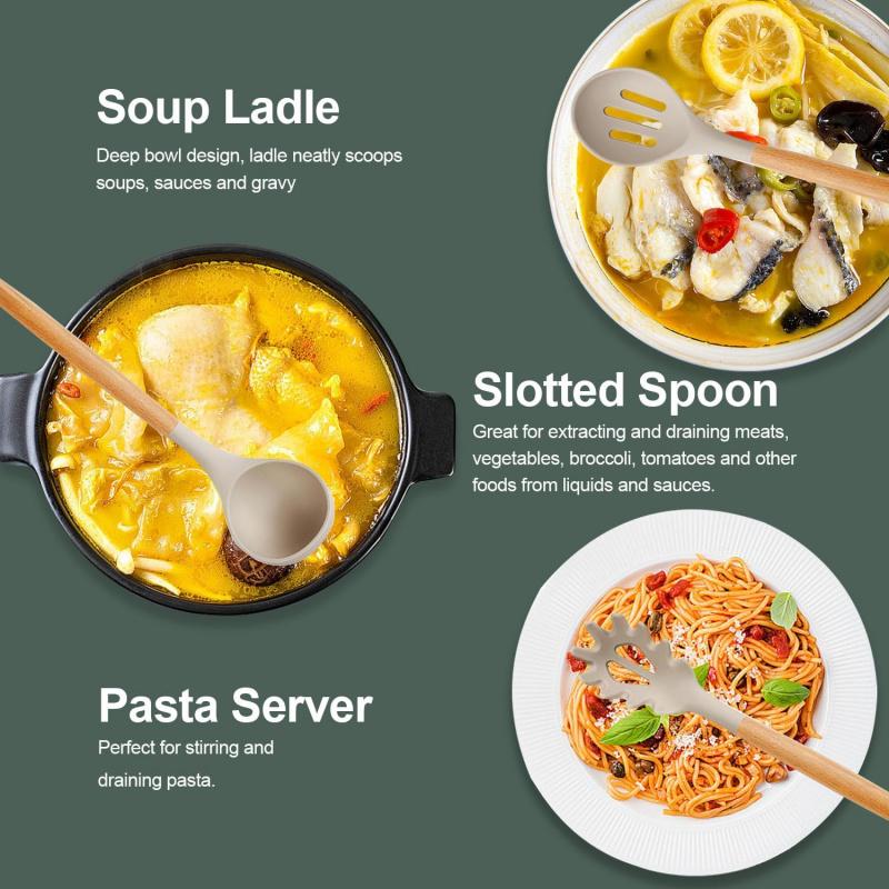 Cooking Utensil Set - 33 Piece Non-Stick Silicone Kitchen Utensil Kit with Wooden Handle, Bating Brush, Egg Beater, Tongs.