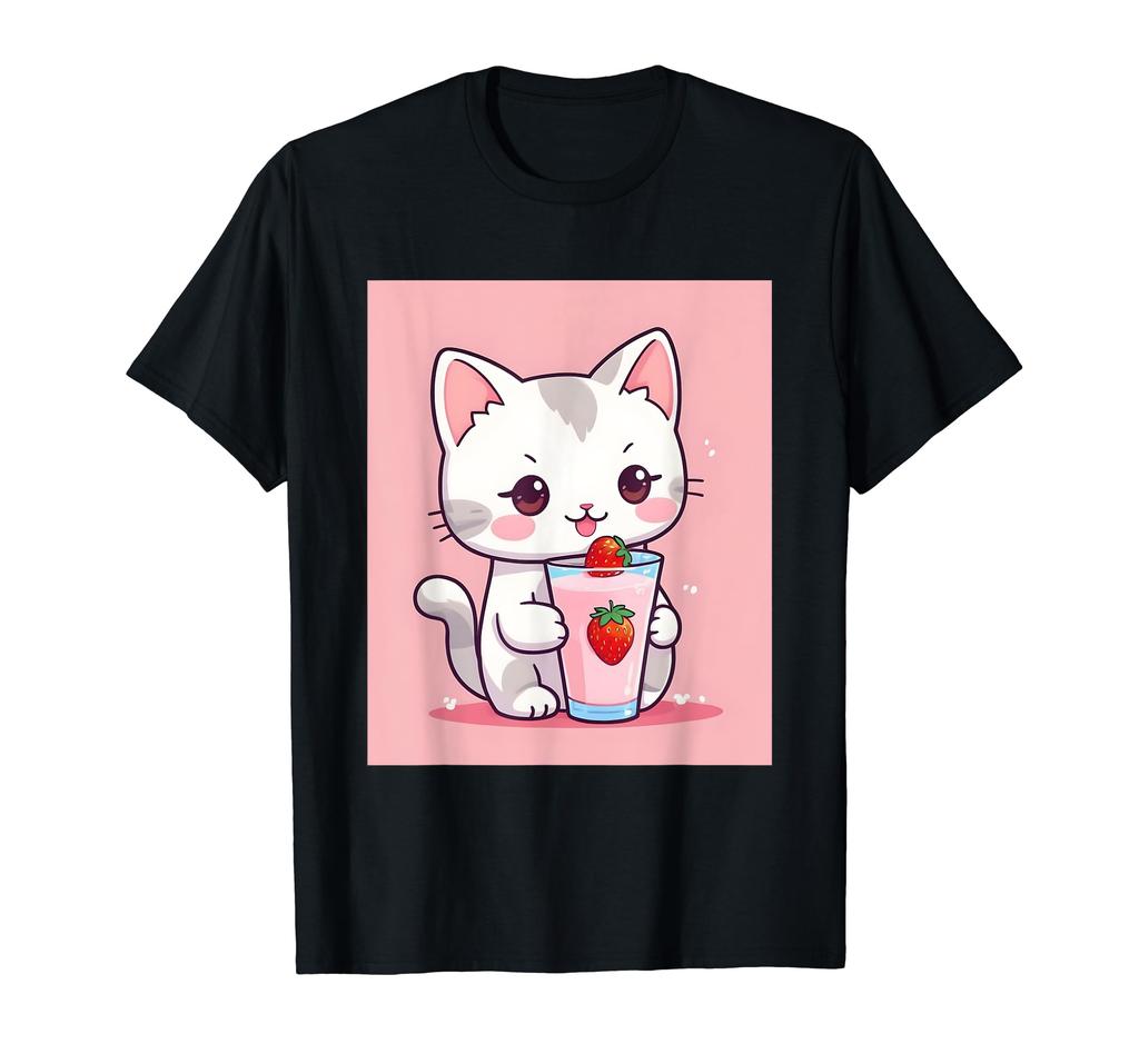 Jahodové věci potištěné Kawaii, kočka, mléko, roztomilý, japonský, tričko