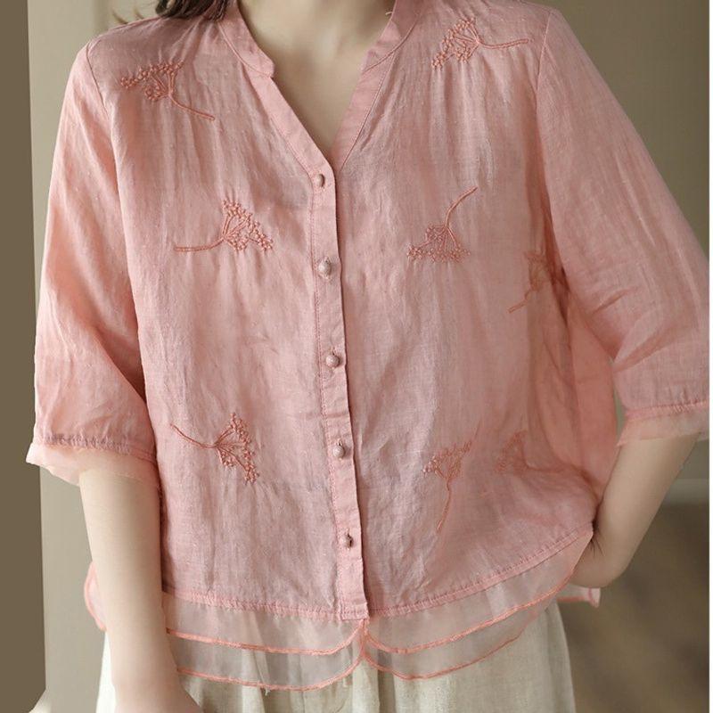 New retro cotton and linen shirt women's literary cardigan embroidered shirt temperament splicing design sense thin top — koupit online v obchodě na marketplace Joom
