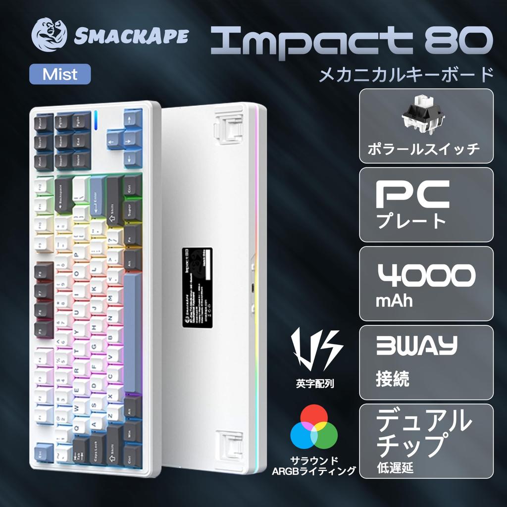 SmackApe Impact 80 — Mechanická klávesnice s high-endovým zvukem a působivou přizpůsobitelností, ideální pro ty, kteří hledají špičkovou klávesnici. ● Výkonná dvoučipová architektura s ultra nízkou latencí kolem 2 ms. Vybaveno 144MHz hlavním MCU a 72MHz vysokorychlostním bezdrátovým čipem. Pyšnící se nízkou latencí a plynulým provozem a plně kompatibilní s VIA, umožňuje vám volně přizpůsobit rozložení kláves a funkce podle vašich představ.. ● Konektivita: 3cestné připojení: Kabelové (Typ-C), 2,4 GHz bezdrátové a Bluetooth (přepíná mezi až třemi zařízeními). Okamžitě přizpůsobitelný pro jakoukoli situaci, od práce po hraní.. ● Ohromující světelný zážitek: ARGB + boční světelná lišta. Horní a dolní kryt obsahují matný PC difuzor o tloušťce 1,4 mm.. 32 LED diod vytváří fantastický, nepřímý RGB efekt ze stran a zezadu. Přizpůsobte jas, barvu a efekty. ● Bezpečný a tichý design základny. Klávesnice je obrácená a uložena samostatně ve spodní části, což eliminuje jakýkoli dopad na zvuk stisku kláves a zvyšuje bezpečnost.. Navrženo k ochraně proti nárazům a elektrickým šokům. ● Vysoce kvalitní materiály a flexibilní struktura FR4 deska nebo PC deska