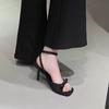 2025 new square head ankle strap silver satin bow high heel cool slippers thin heel open-toed women's sandals