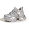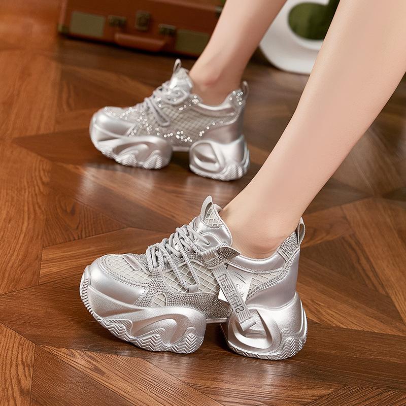 Daddy Shoes Girl 2025 Autumn New Horseshoe Heel Mesh Breathable Rhinestone Platform Shoes Inner Height Increasing Casual Sneakers