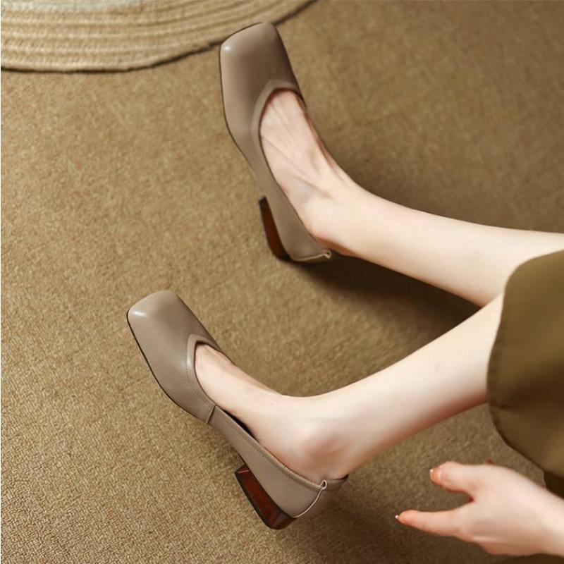Módní boty pro ženy Elegantní lodičky se čtvercovou špičkou Měkká kůže Silný nízký podpatek Podzimní dámská obuv Neformální Jednobarevné Mělké lodičky s podpatkem Ženy — koupit online v obchodě na marketplace Joom