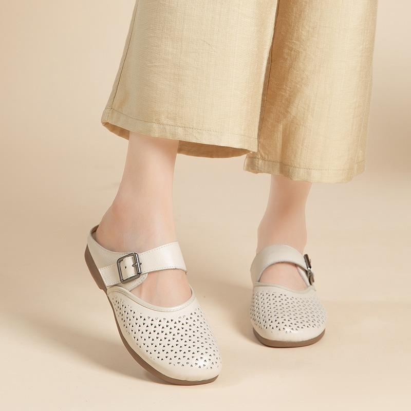 Genuine leather beef tendon soft bottom literary and retro hole bag head half drag women's summer versatile hollow breathable mother slippers — koupit online v obchodě na marketplace Joom