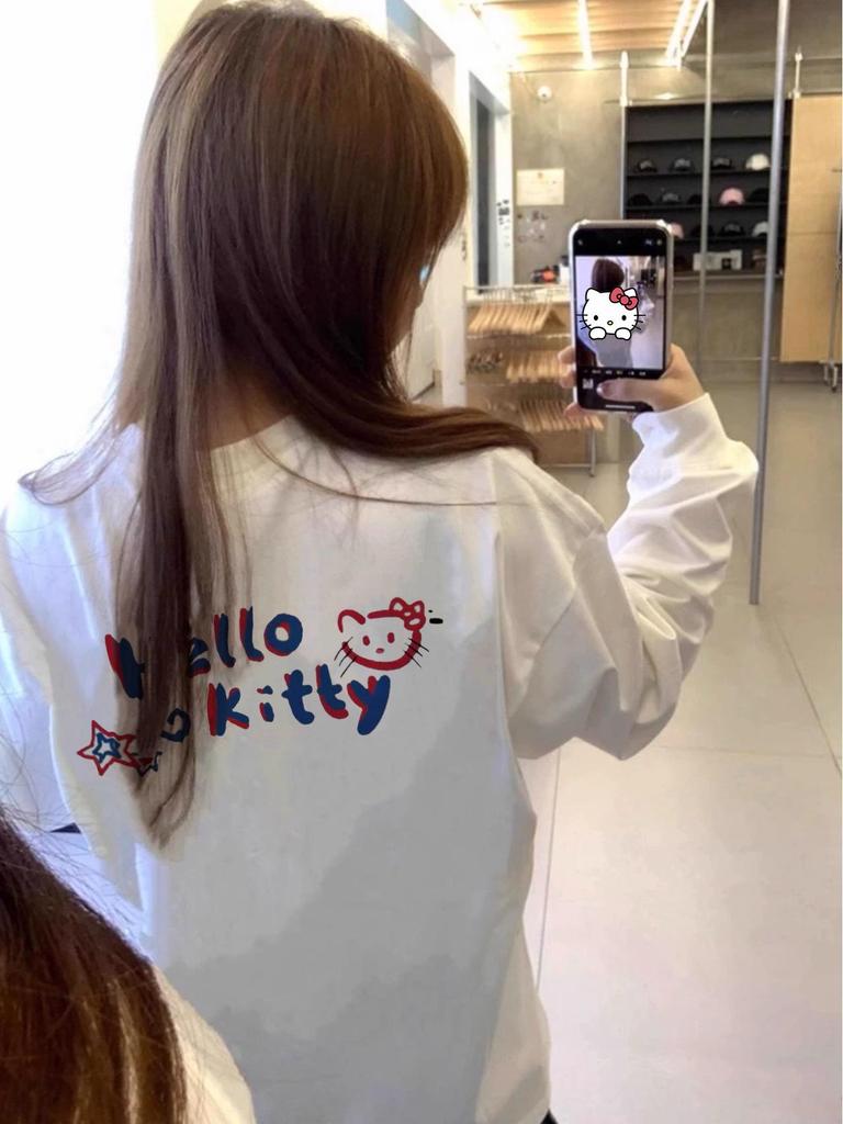 Women's Pure Cotton Slimming Kitty Print White Long-Sleeve T-Shirt with Cinch-Bottom — koupit online v obchodě na marketplace Joom