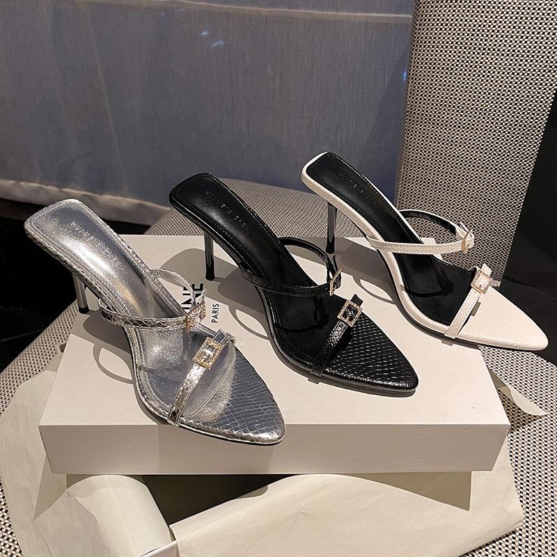 Sexy pointed high heels summer new rhinestone thin heel Roman sandals one word with square buckle open-toed women's shoes slippers