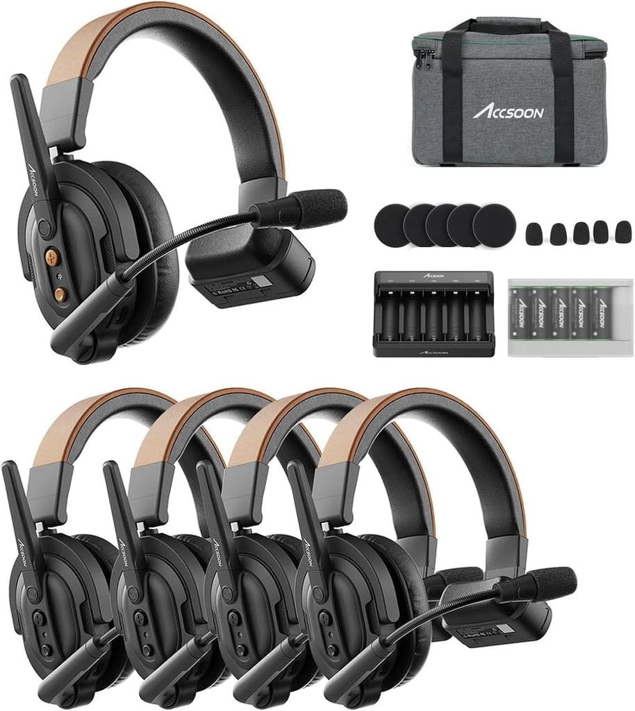 Acccsoon Como SE Wireless Headset Intercom System, 5-Person 2.4GHz Full Duplex Wireless Communication, 1312ft Team Communication Group Talk Headset, 30+ Hour Lifespan, 1 Host & 4 Remote Headsets
