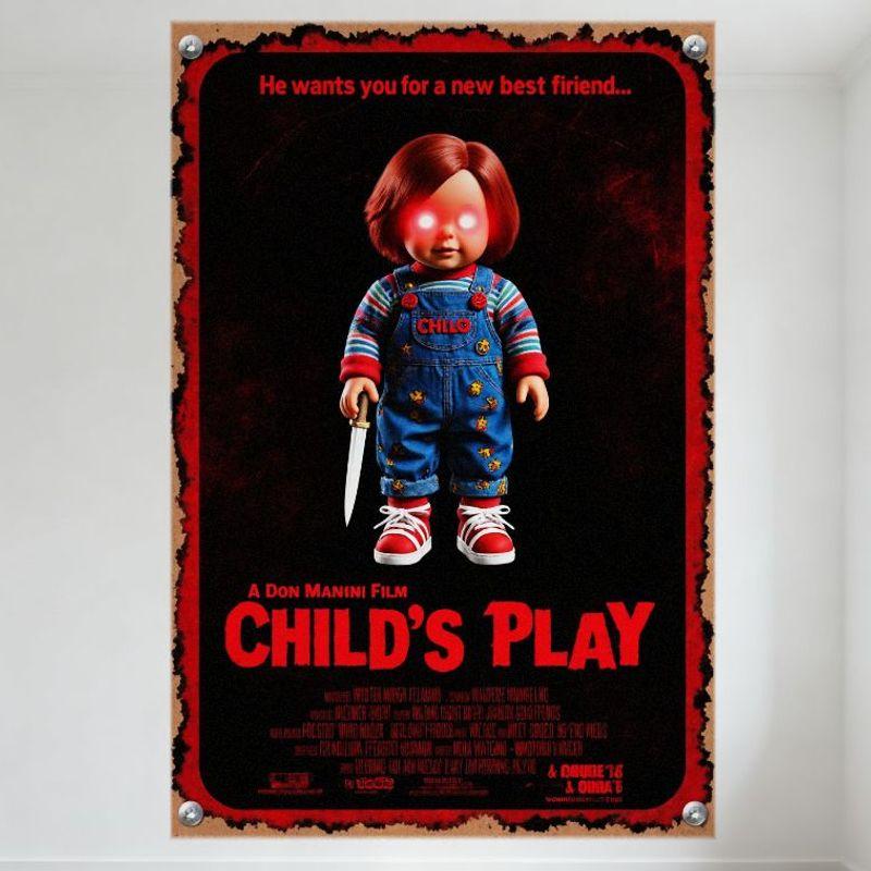 Child’s Play Chucky Red Hair Glowing Eyes Blue Overall Sunflowers Red Sneakers Horror Movie Metal Tin Sign Retro Wall Decor for — koupit online v obchodě na marketplace Joom