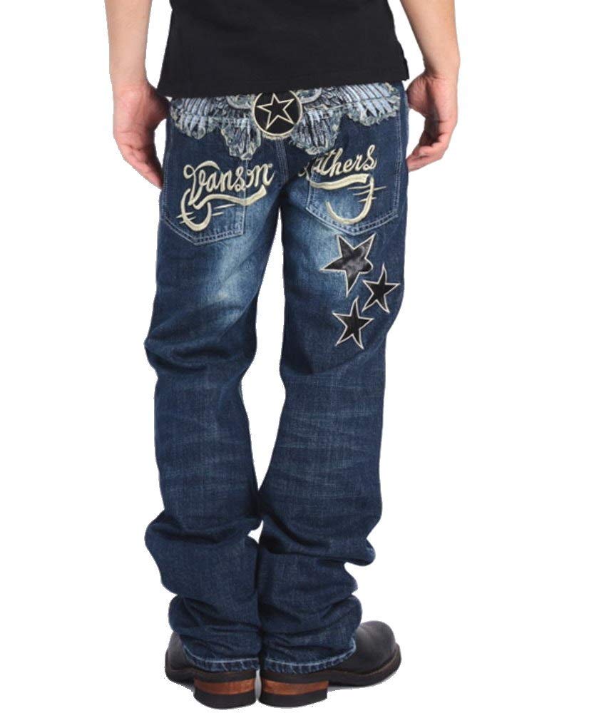 Vanson Flying Star Embroidered PU Leather Distressed Denim Pants & SP-B-15 (Size 30, Indigo)