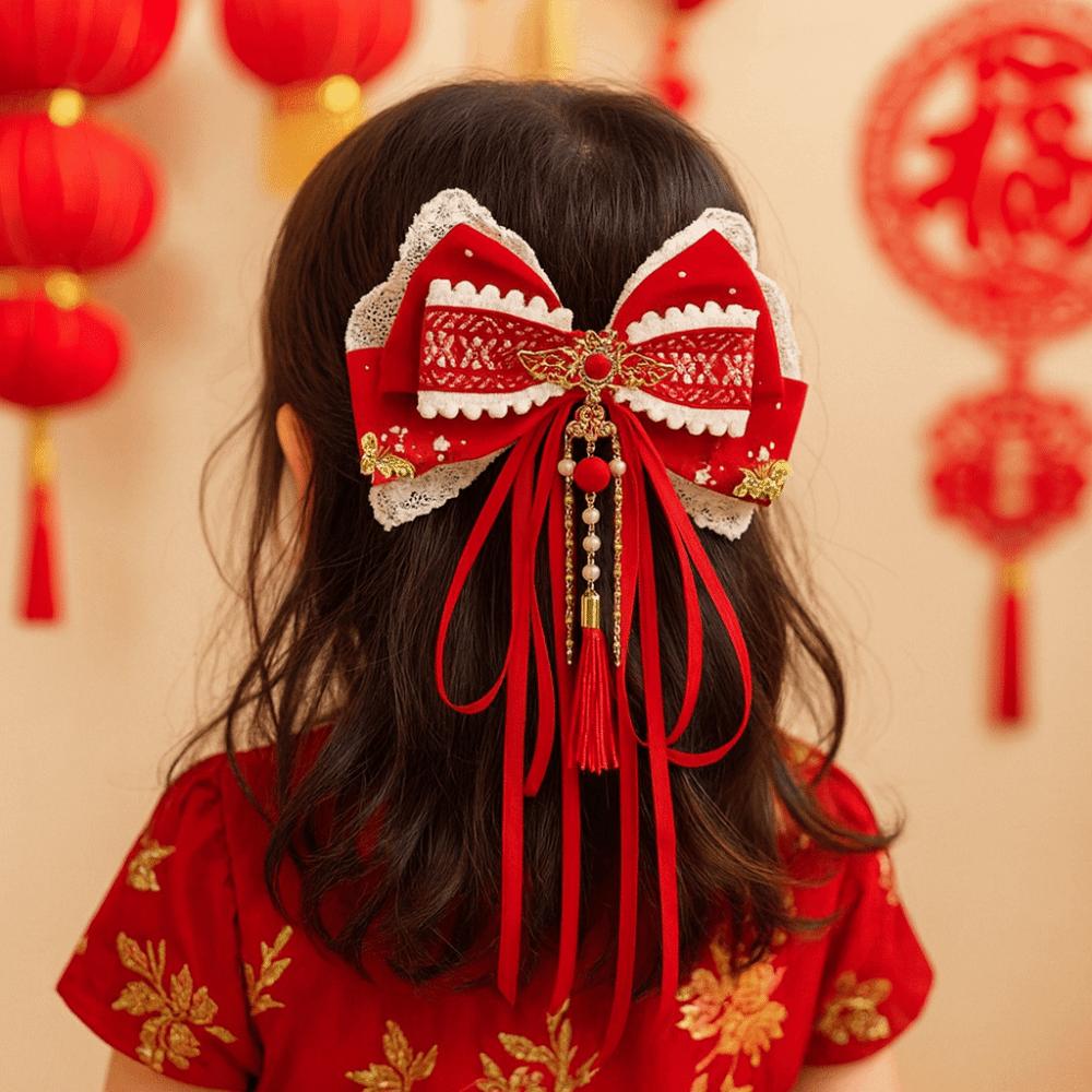 Flower Bow Ribbon Hair Clip Tassel Hanfu Hair Ornamen Cute New Year Hairpin Girls