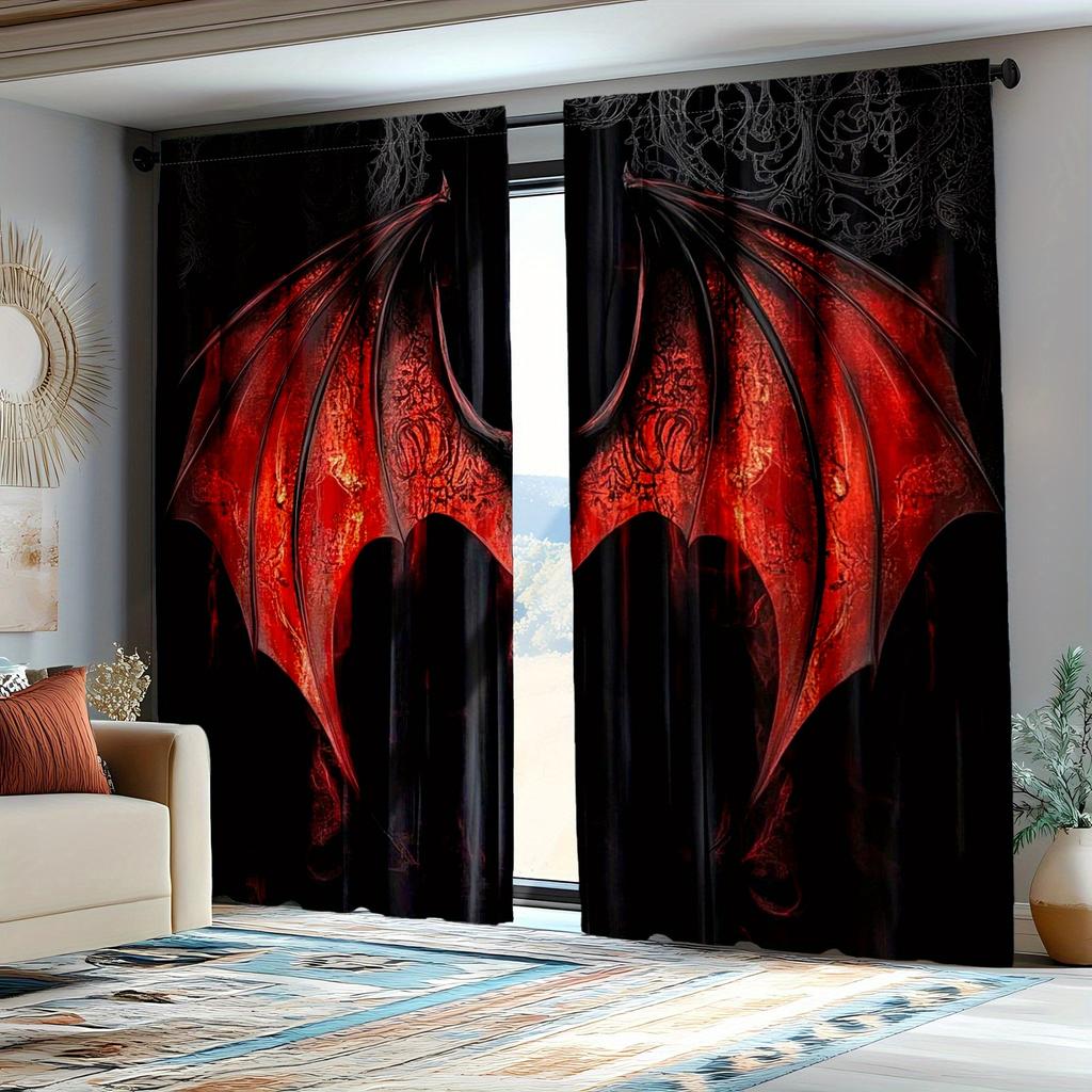 2 ks Gotické červené závěsy se vzorem netopýra Poloprůhledné polyesterové závěsy se složitým černým designem pro ložnici a obývací pokoj De — koupit online v obchodě na marketplace Joom