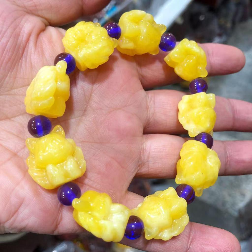 Beeswax Bear Bracelet with Amber Chain & Patina Bear Pendant in Chicken Fat Yellow