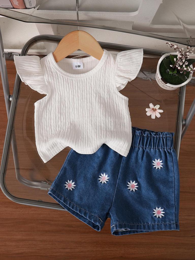 Infant Girls' Summer Two-Piece Set: Flying Sleeve White Ribbed Top & Daisy Denim Shorts