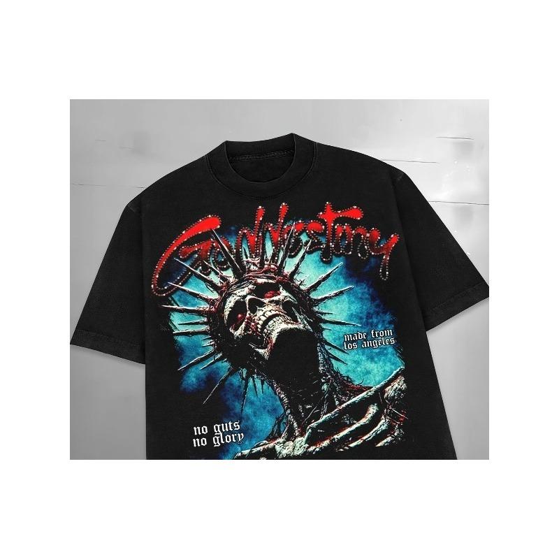 European sizes Streetwear T-Shirt with "No Guts No Glory" & Print - Spike-Headed Red-Eye Skull Graphic, Digital Sublimation Tee for Hip-Hop Style,