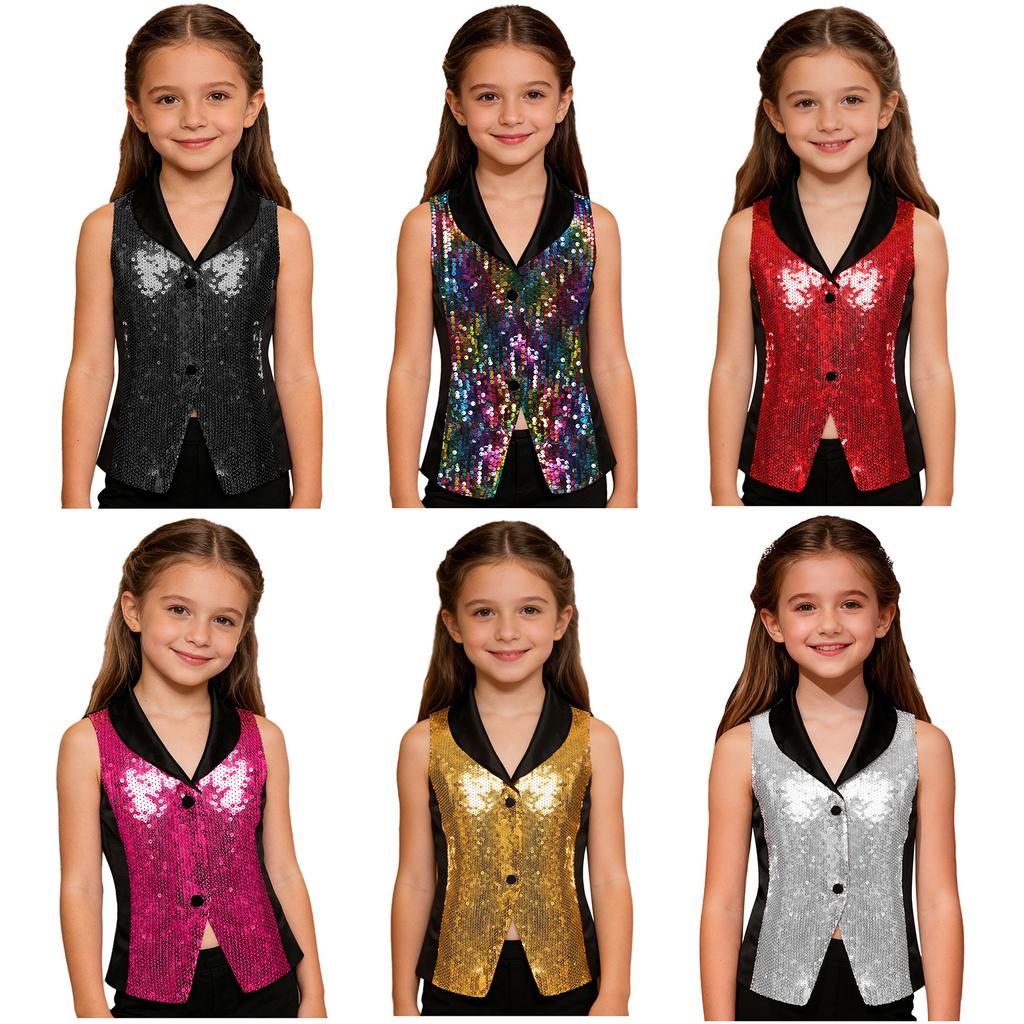 Třpytivá pódiová vesta pro dívky: Saténová vesta s kontrastními barvami, klopovým výstřihem a patentkami, Nezbytnost pro taneční kostým — koupit online v obchodě na marketplace Joom