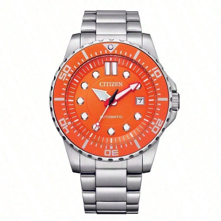CITIZEN AquaMechanical Fashion Watch: Mechanical Movement, Stainless Steel Strap, Japanese-Korean Style for Men, Orange Dial, Model NJ0128-80X