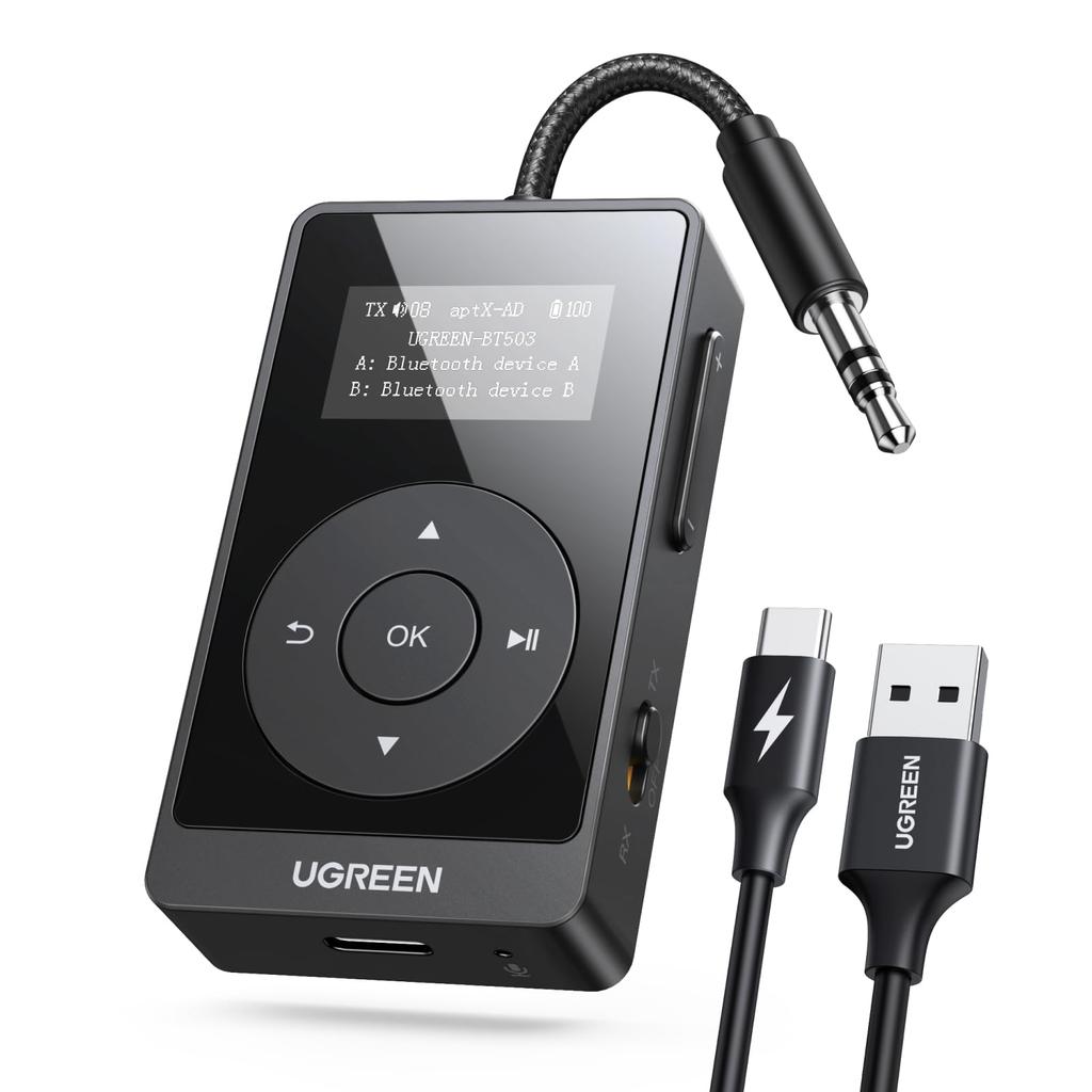 UGREEN Bluetooth 5.3 transmitter and receiver, for two in-flight Airpods, transmitter and receiver 2-in-1, AptX Adaptive/HD compatible, 3.5m Aux audio Bluetooth adapter, for in-flight, car stereo, and TV use, a must-have for air travel, TELEC certified.