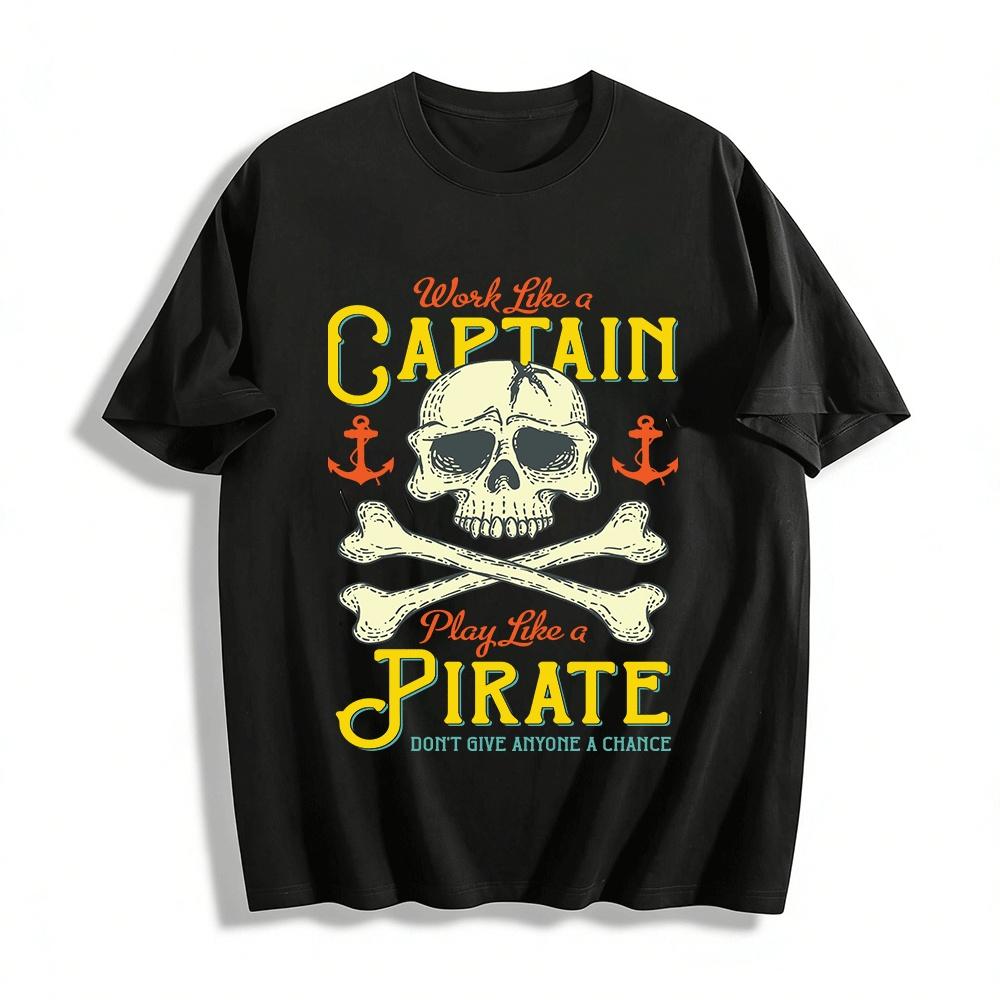 Work Like a Captain Play Like a Pirate Slogan Skull Graphic Tee Pure cotton T-shirt
