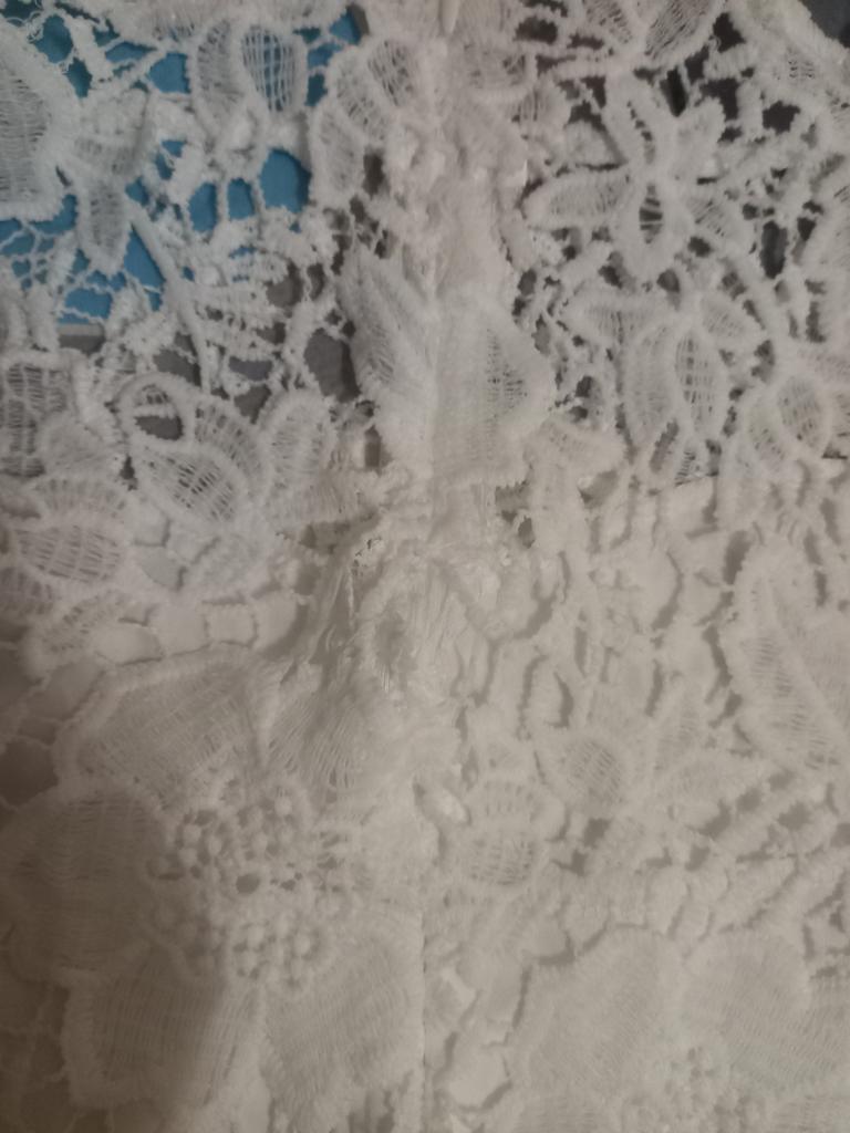 Das Kleid ist sehr schön, sieht toll aus. Die Größe passt. Ich habe einen Stern abgezogen, weil ein Ärmel drei oder vier Zentimeter kürzer ist als der andere und der Hals nicht ganz gleichmäßig ist, er muss korrigiert werden (.