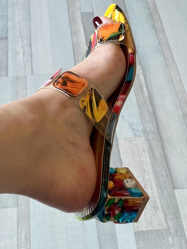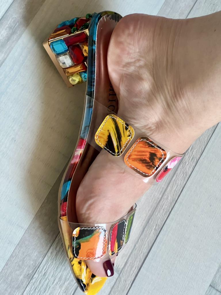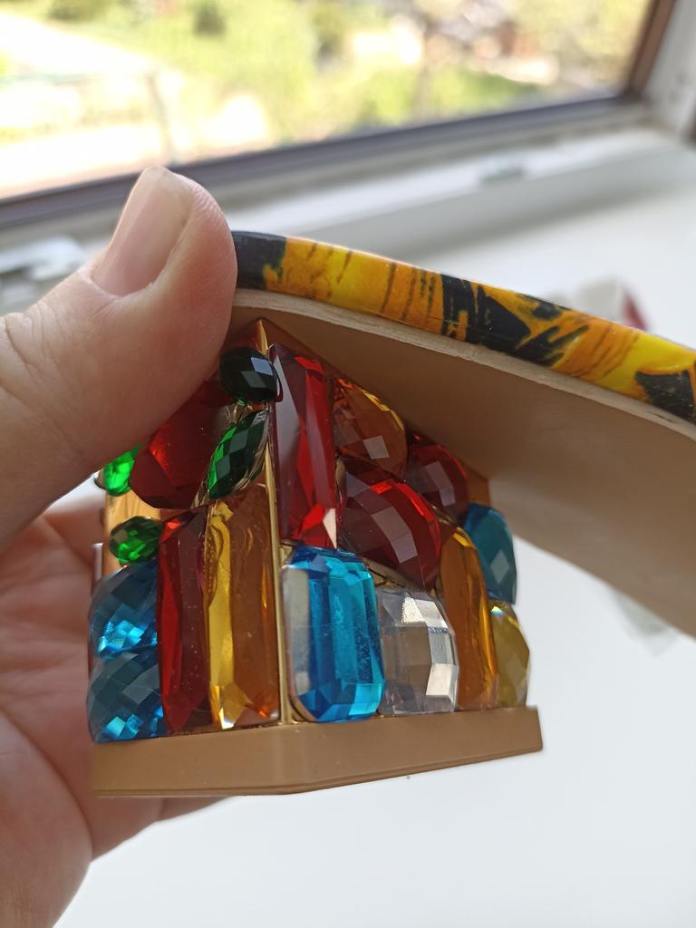 Cool, vor allem der Absatz – ganz mit Steinen bedeckt. Sie fallen etwas klein aus, denken Sie daran. Sie ziehen die Blicke auf sich! Der Absatz ist nicht hoch, aber ich kann nicht sagen, dass der Schuh absolut bequem ist; man spürt, dass es keine flache Sohle hat.
