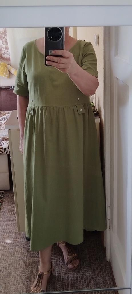 Wunderschönes Kleid. L passt 50. Die grüne Farbe ist ein sattes Olivgrün. Stoff – Baumwolle mit Crinkle-Effekt.
