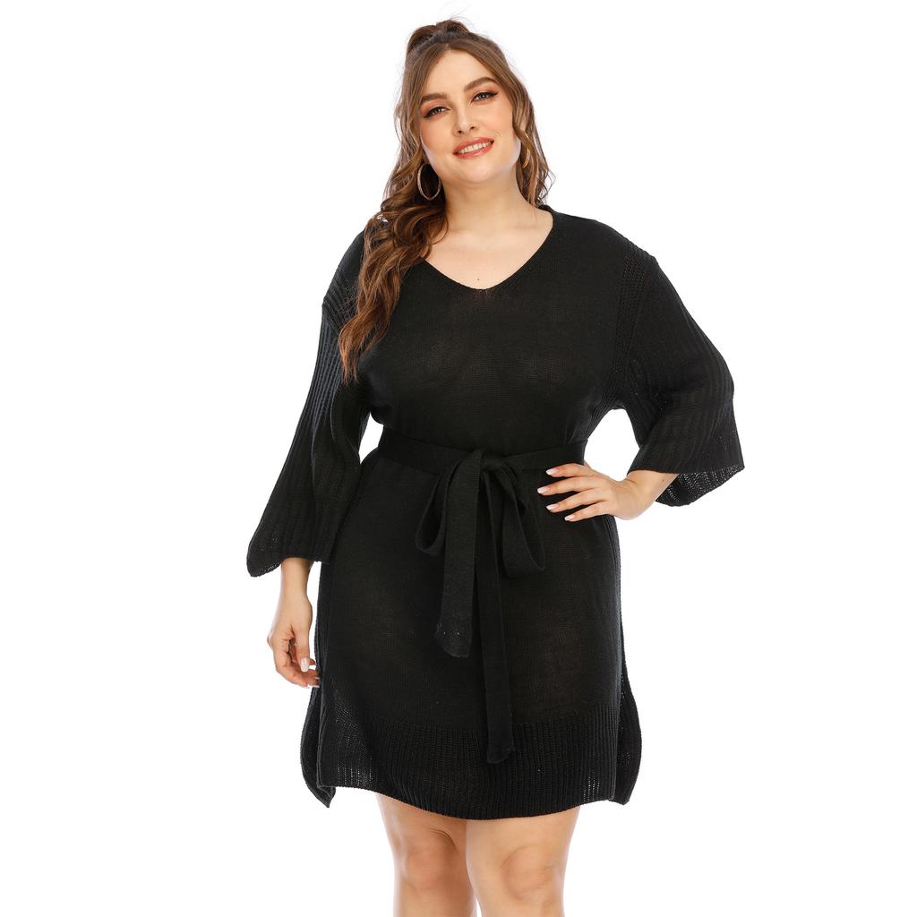 Damen Herbst und Winter Große Größe Glockenärmel Strickkleid Taillengürtel Kleider — günstig online bei Joom kaufen