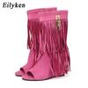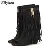 Mode Eilyken Frühling Sommer Design FRANSEN Keilabsätze High Heels Damen Stiefel Sandalen Reißverschluss Peep Toe Bankett Party Kleidschuhe