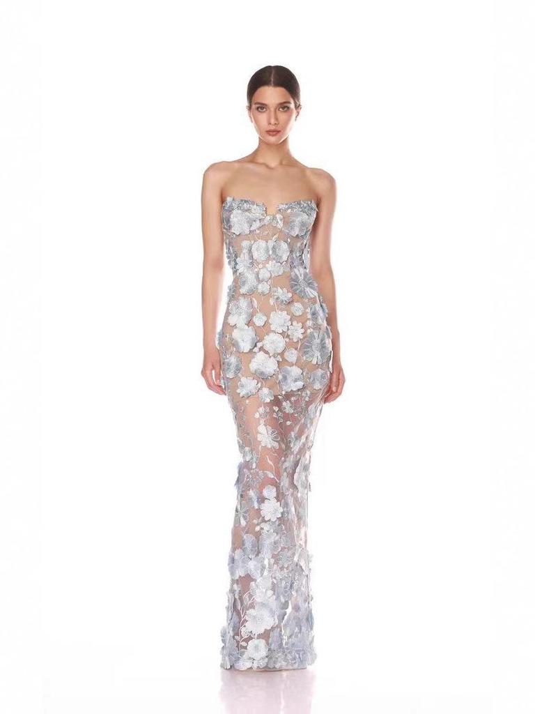 Europäisches & Amerikanisches Design Trägerloses Blaues Abendkleid mit 3D-Blumen-Details — günstig online bei Joom kaufen