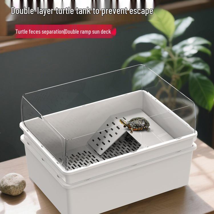 Eco-Friendly Turtle Habitat: Dual-Layer Tank with Waste Separation & Green Plant Landscaping.